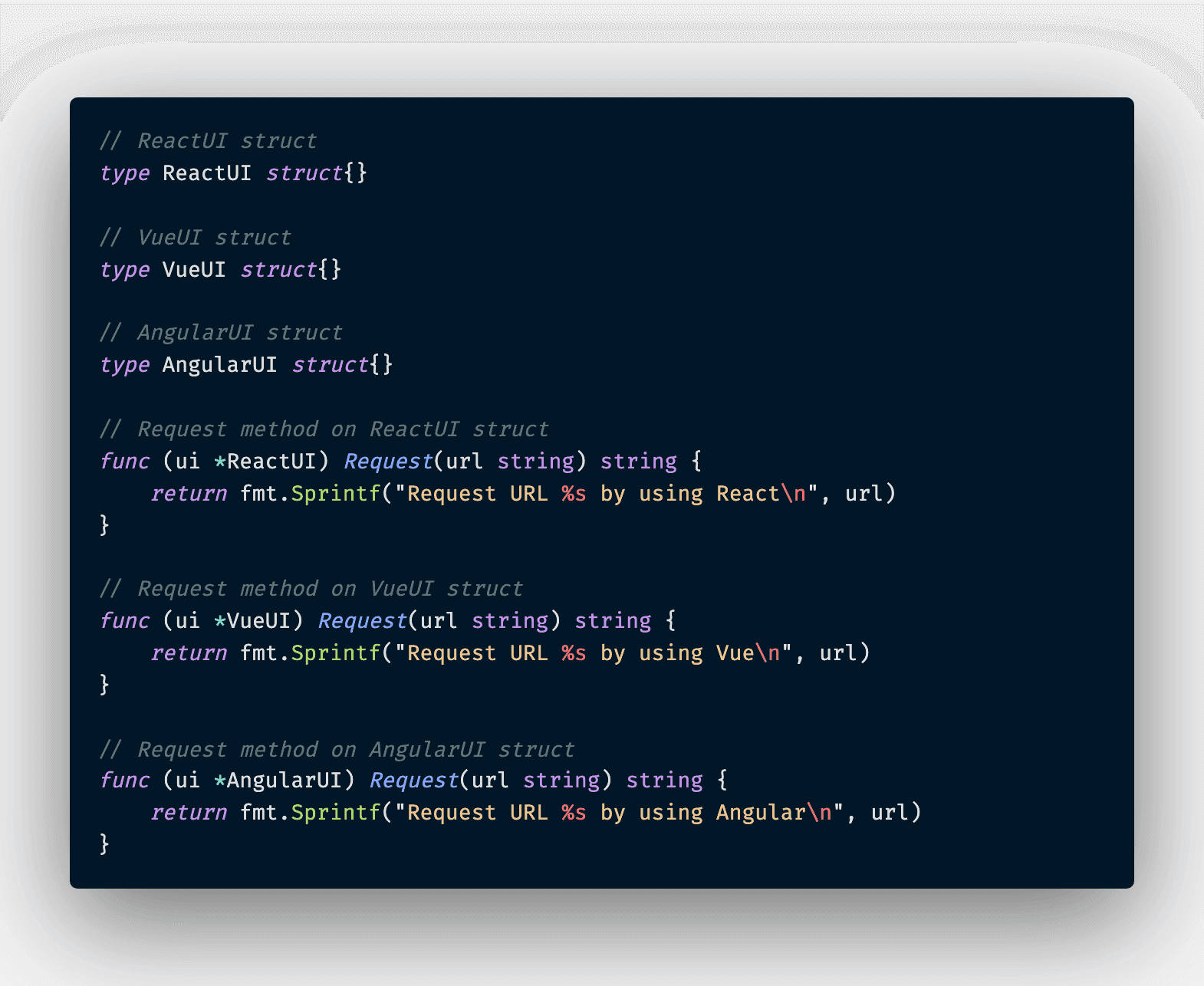 And finally, we need to implement couple of struct that satisfy the Request interface so that the client code can call upon