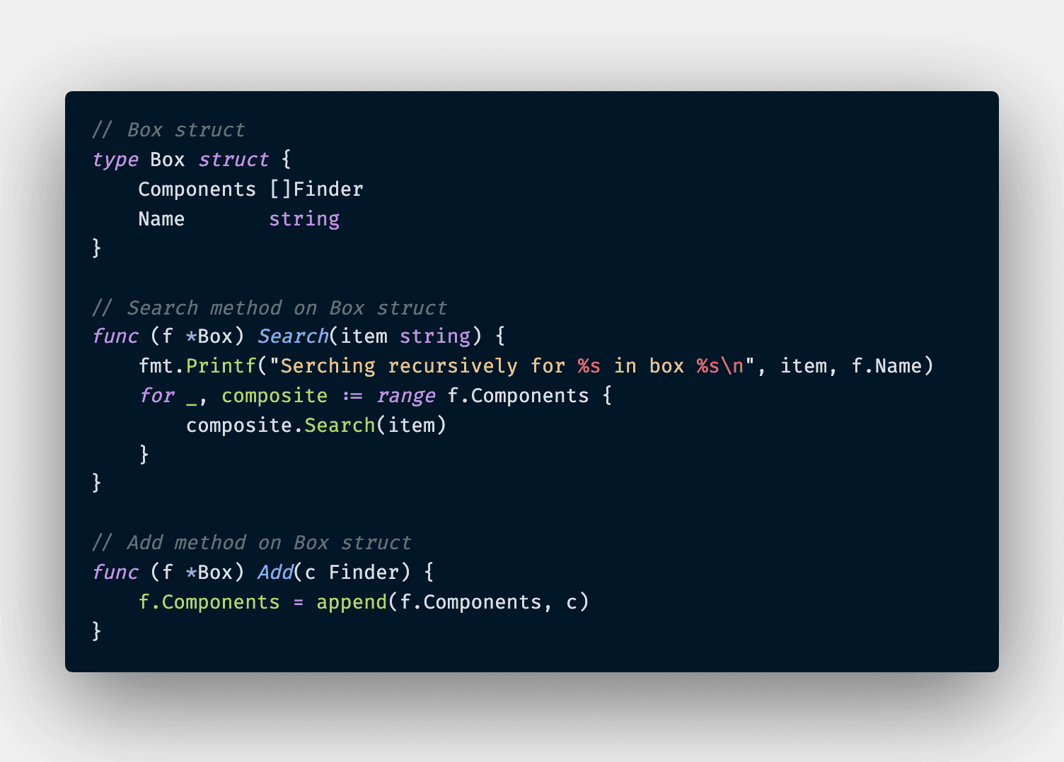 And finally is the container object which is Box struct which can contain another Fox and File