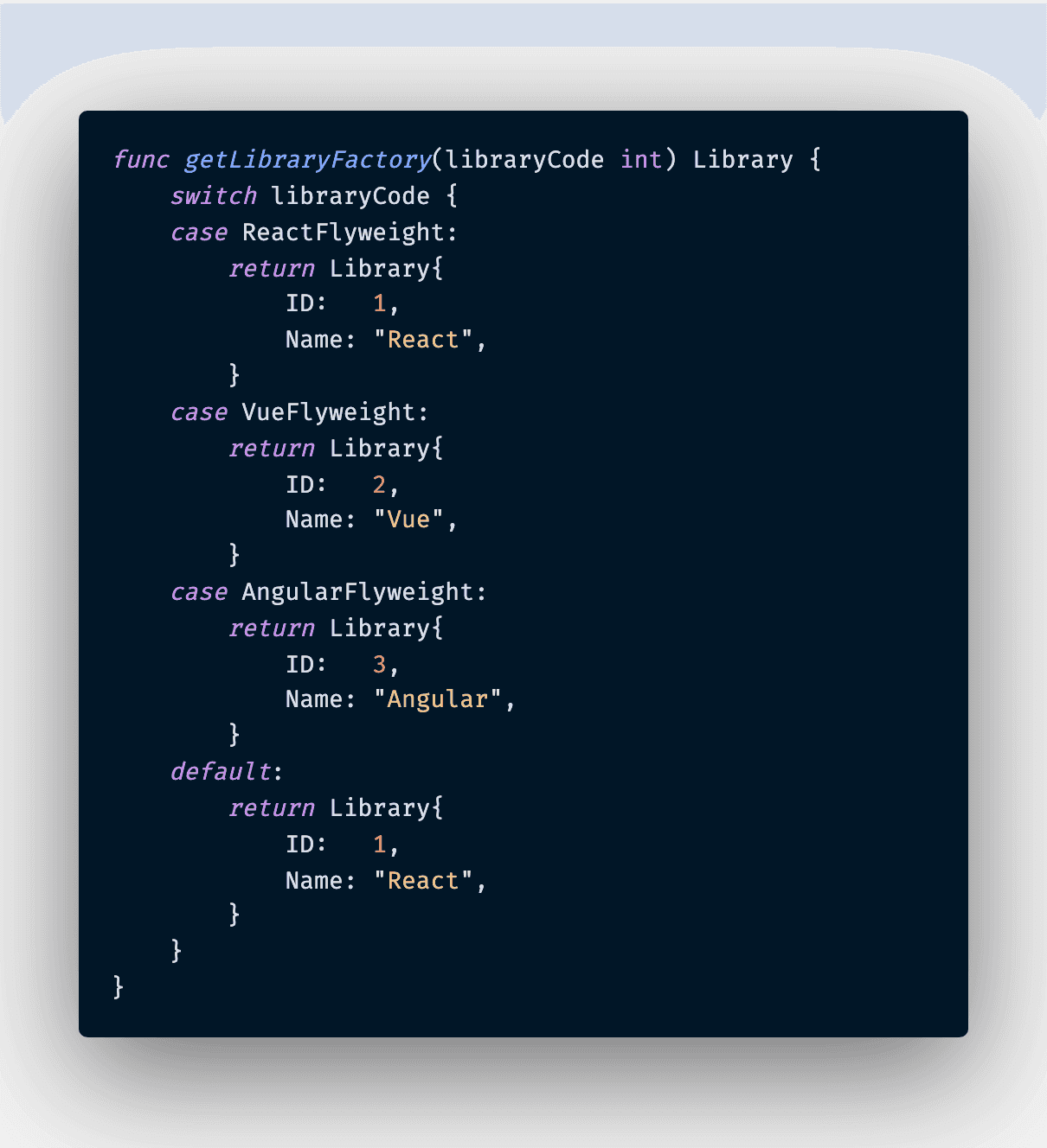 Let's put the definition above into practice. We have a list of three library that will be used differently at run time, the libraries' state can be made extrinsically such as name and ID. There is no need to re-create these fields all over again to save memory footprint. We would need a factory and cache pool to alleviate that. First up, we want to have a library structure as below