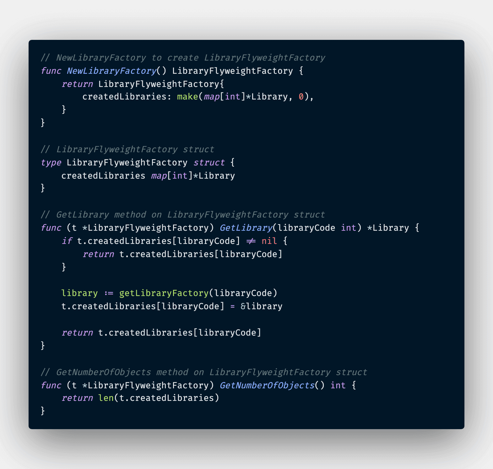 And there we have a complete implementation of Flyweight Pattern in Go. With this library, memory can be saved a ton at scale in tradeoff a more complexity added to the codebase. Hence, this pattern should be used with caution