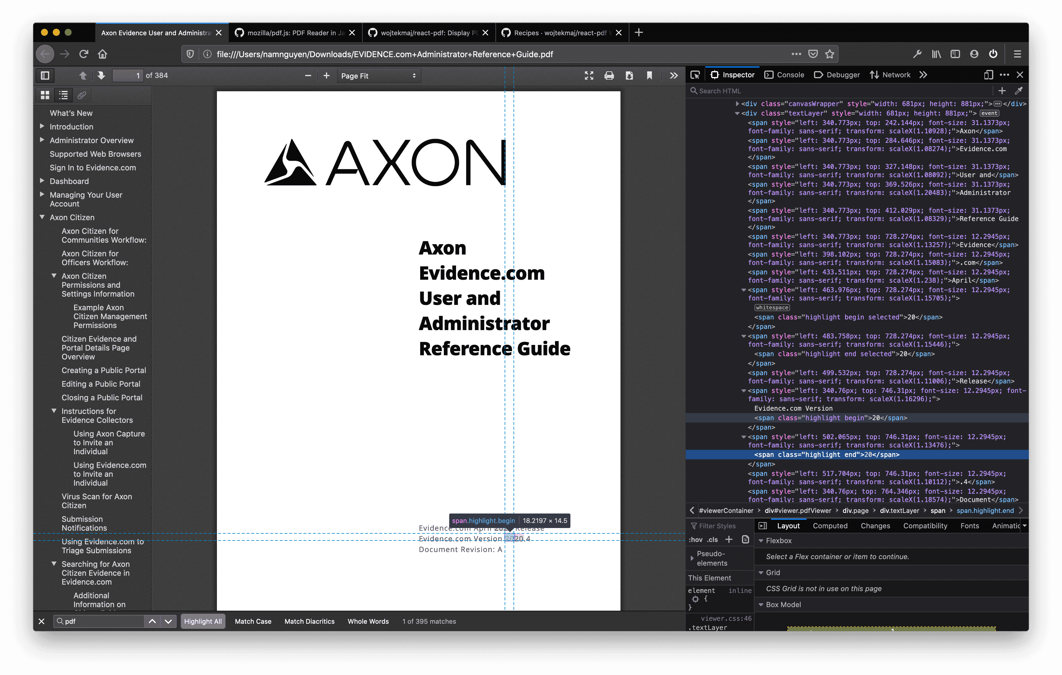 AXON's mission is to write code, save life. We provides solution for police officers to work on daily basic tasks. The most common task would be collect different kind of evidences to work on cases. This ranges from audio, video, document, et cetera. For years, our PDF viewer's capability is very limited as it does nothing more than render static pdf page as image. Up until last year, as our customers would like to have advanced functionalities added to the current PDF viewer. The most wanted one is search functionality. This post goes into details on how I did that 📚