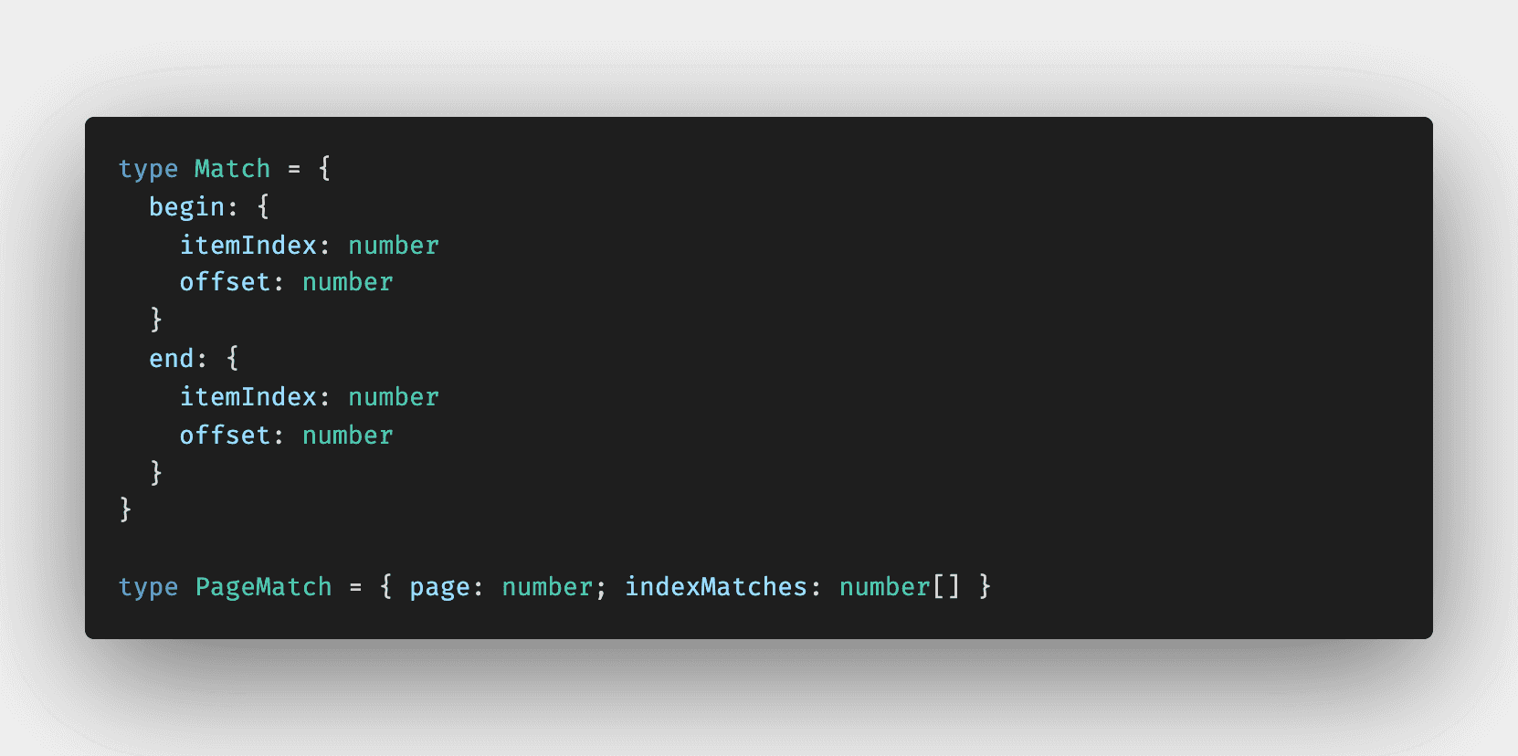 In order to have things work in harmony with react-pdf. We needed two interfaces, the first one is PageMatch which store a page number and list of indexMatches to indicate the beginning index of the match. The second one is the individual Match on page. This will help out the highligh logic inside react-pdf, as we needed to determine which part of the element needed to be highlighted