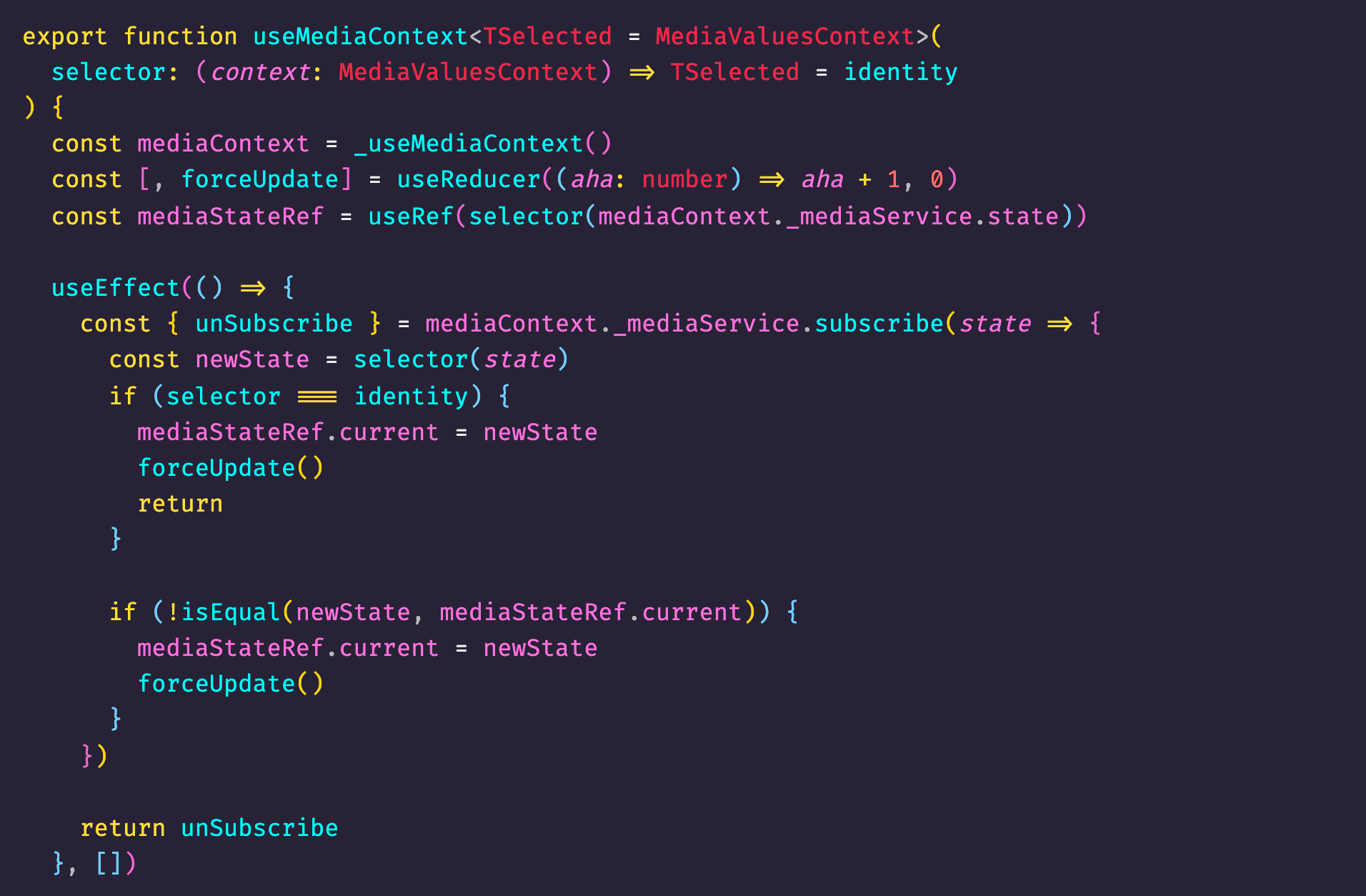 There was still one thing that really bogged me down. After third try, I had one media performant hook in place to return partial state and normal media hook to return full state. This increases the API interface for developers to learn and more decisions to make when to use which hook. What if I could combine them into one hook, provide strongly typing out of the box, reusable code in other places such as HOC and Render Prop, and option to select partial state for performant purposes. This is where I struggled a bit with TypeScript since I'm not an expert 😆. After couple of researching hours, I found the solution. It looks almost identical to useSelector from React-Redux library with one subtile difference. The useMediaContext hook below will return by default all state from media context values if custom selector is not passed in and the selective values will be returned otherwise with typing support. The solution is pretty clean as below 😬