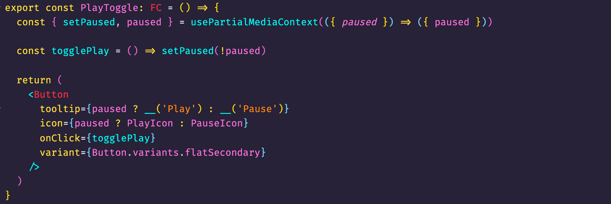 The quickest and simplest one would be splitting connected component into two separate components for optimization (similar to container and presentational pattern famous back in the day of React's world). Now we can apply React.memo or even useMemo hook if that kind of API fancies your tickle 😄. The presentation component will be checked on props changes. In case of PlayToggle button component, the props it receives will be paused and setPaused. These are simple to compare when React's re-rendering process kicks in. This solution works fairly okay but does not seem to be good enough.