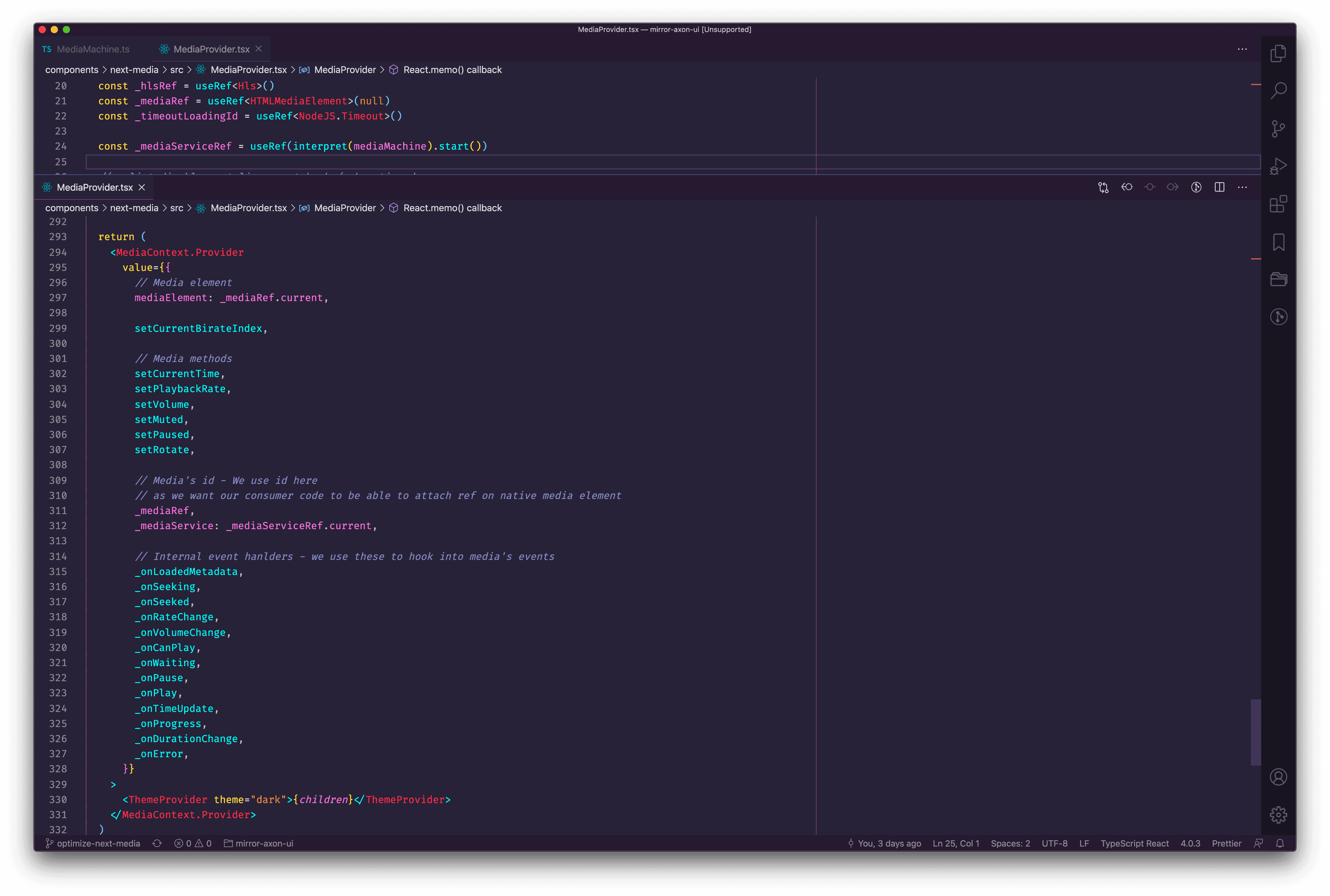 It has one finite state only called ready and some infinite states (media state) placed in context of XState. Now, all I need to is hook this up to MediaProvider. On initial load, I start the machine and place it inside ref for later use. Since there is not any state placed inside MediaProvider, it won't be re-render on state change anymore and the media state is placed safely in mediaMachine's context.