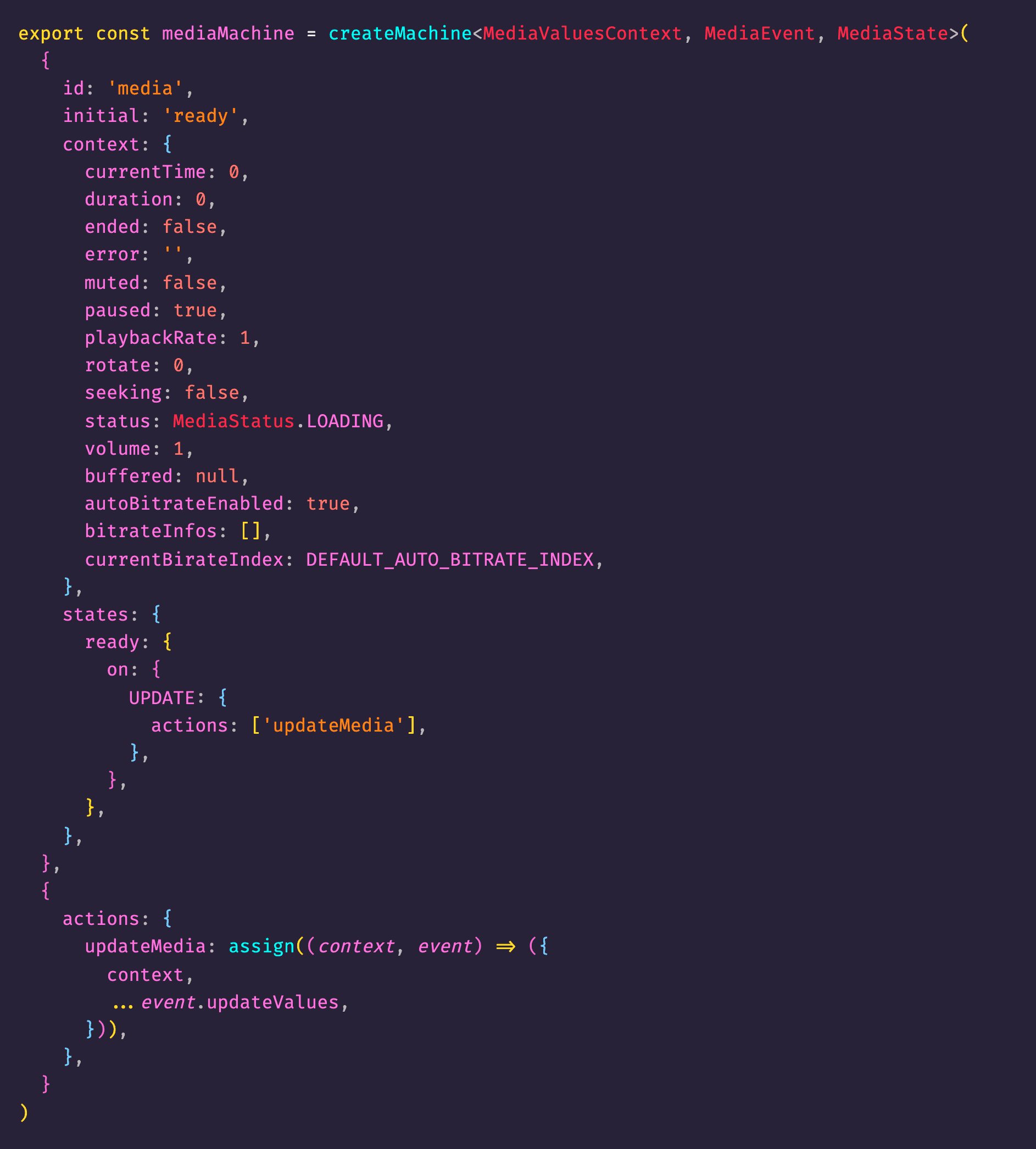 In XState, we have a concept of state machine which is exactly what I need to use to store media context state. I created a very simple state machine for media called mediaMachine as the following: